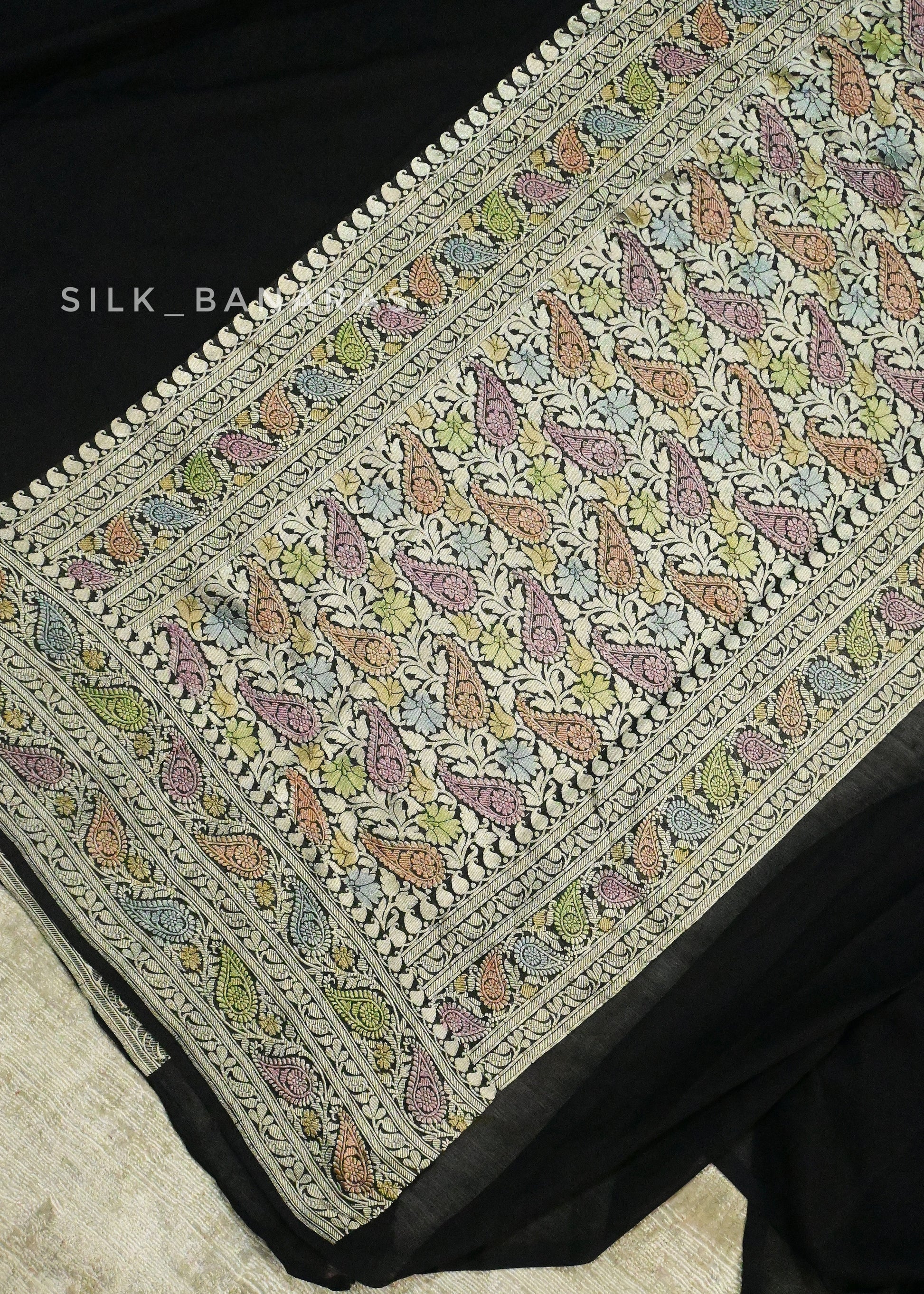A striking black canvas showcases the magic of Banarasi weaving with its spectacular multicolor paisley border. Each pastel-hued motif is meticulously handwoven, creating a playful yet sophisticated contrast against the deep black base.
