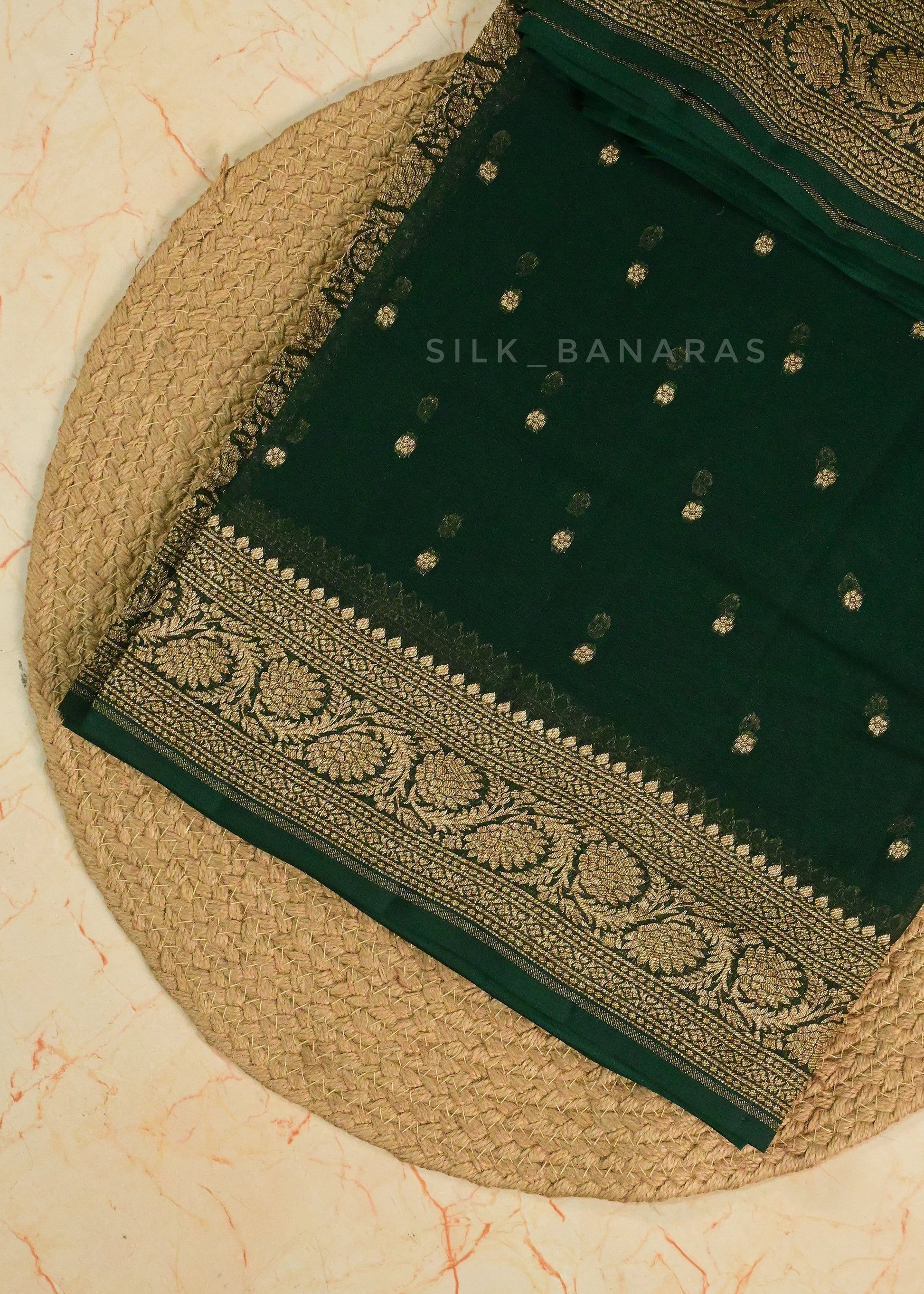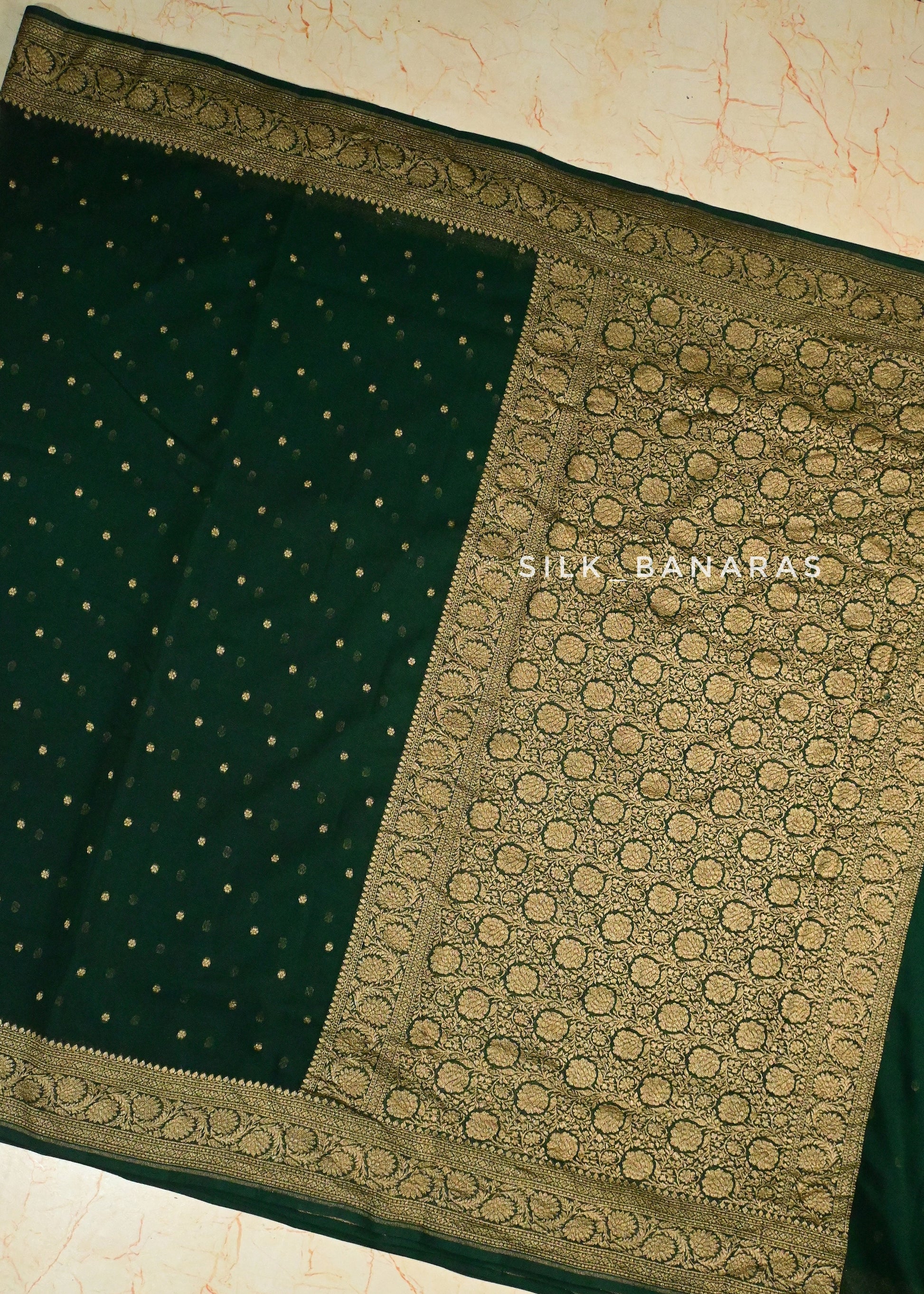 Pure opulence meets timeless elegance in this emerald green masterpiece. Delicate golden butis dance across the body, leading to a breathtaking pallu featuring elaborate circular motifs and intricate vine patterns in rich golden zari.
