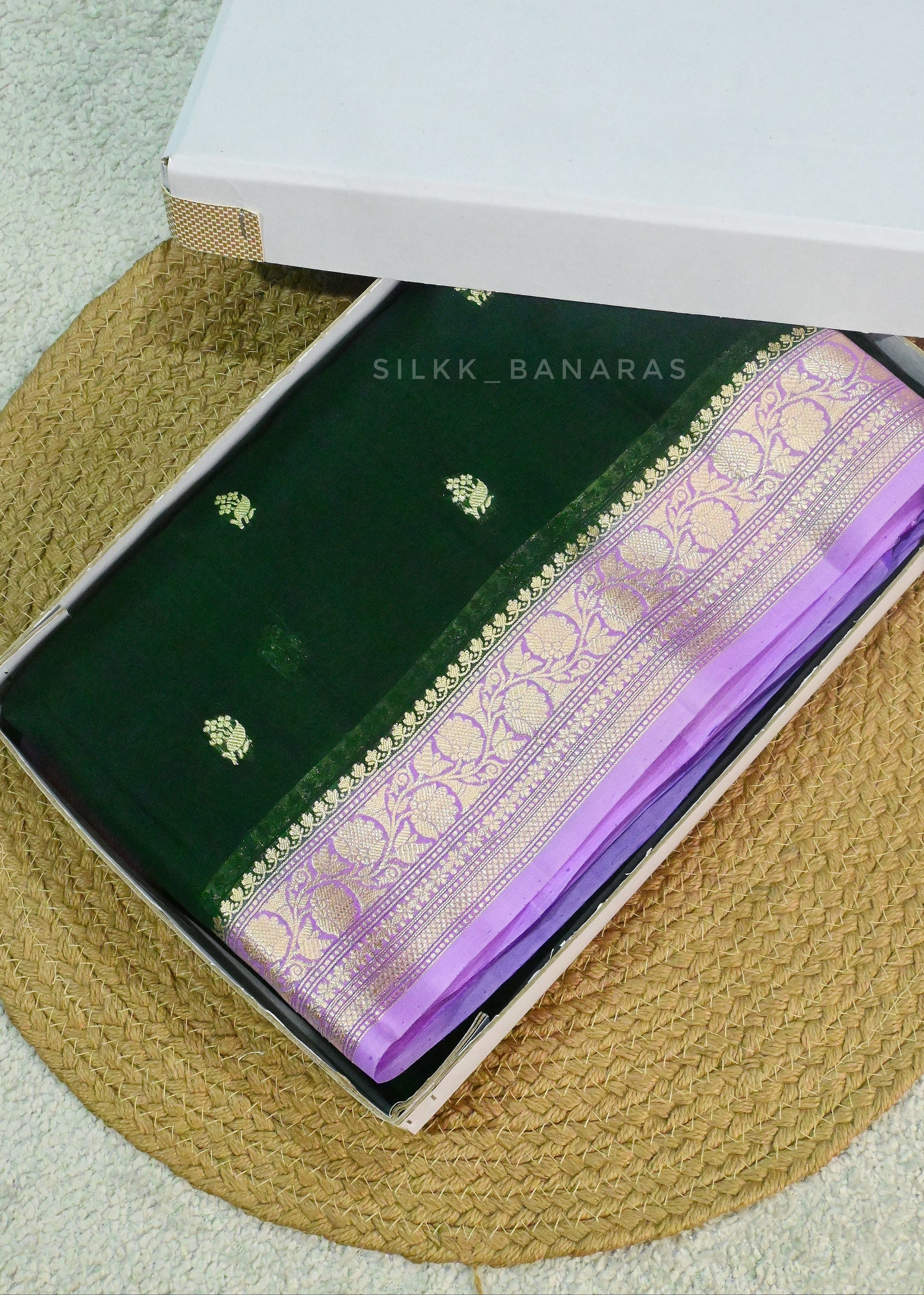 A breathtaking color combination where deep emerald green meets royal purple. The body features delicate golden butis while the pallu showcases elaborate zari work in geometric patterns with floral motifs – a true Banarasi masterpiece.