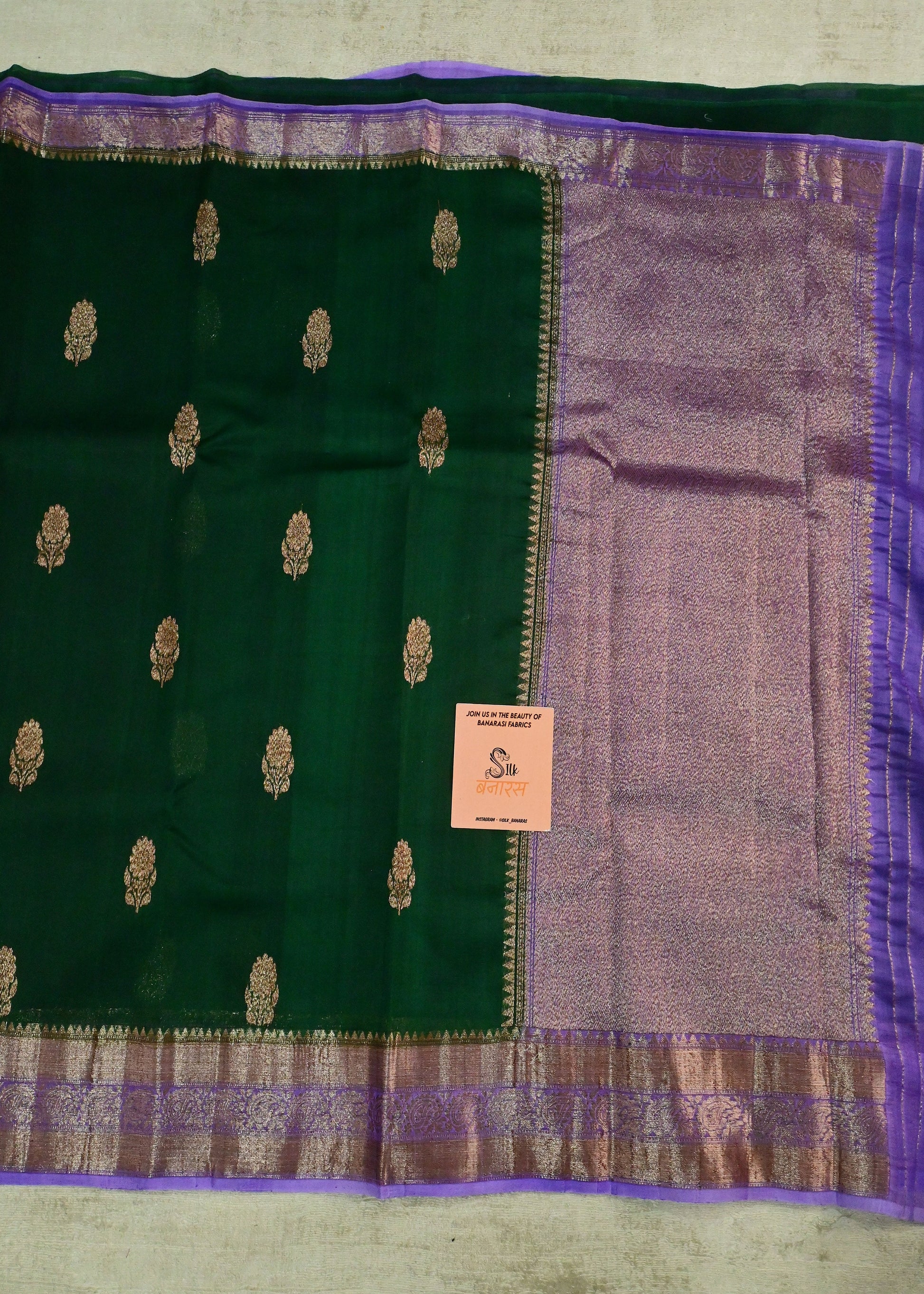 A regal masterpiece where deep emerald meets royal purple! This stunning saree features golden butis scattered across a rich green body, transitioning to a magnificent purple pallu with shimmering brocade work – a combination fit for royalty.