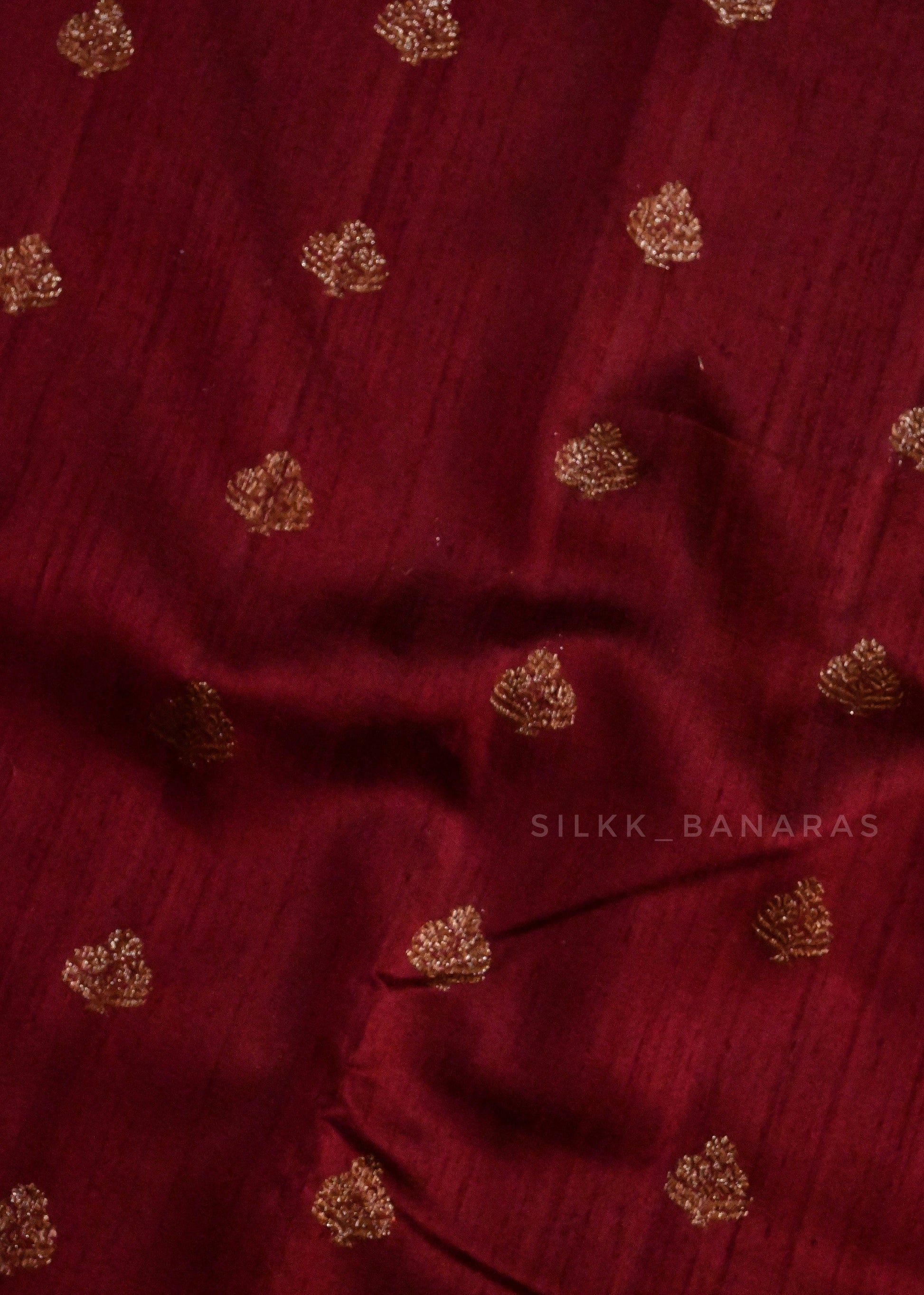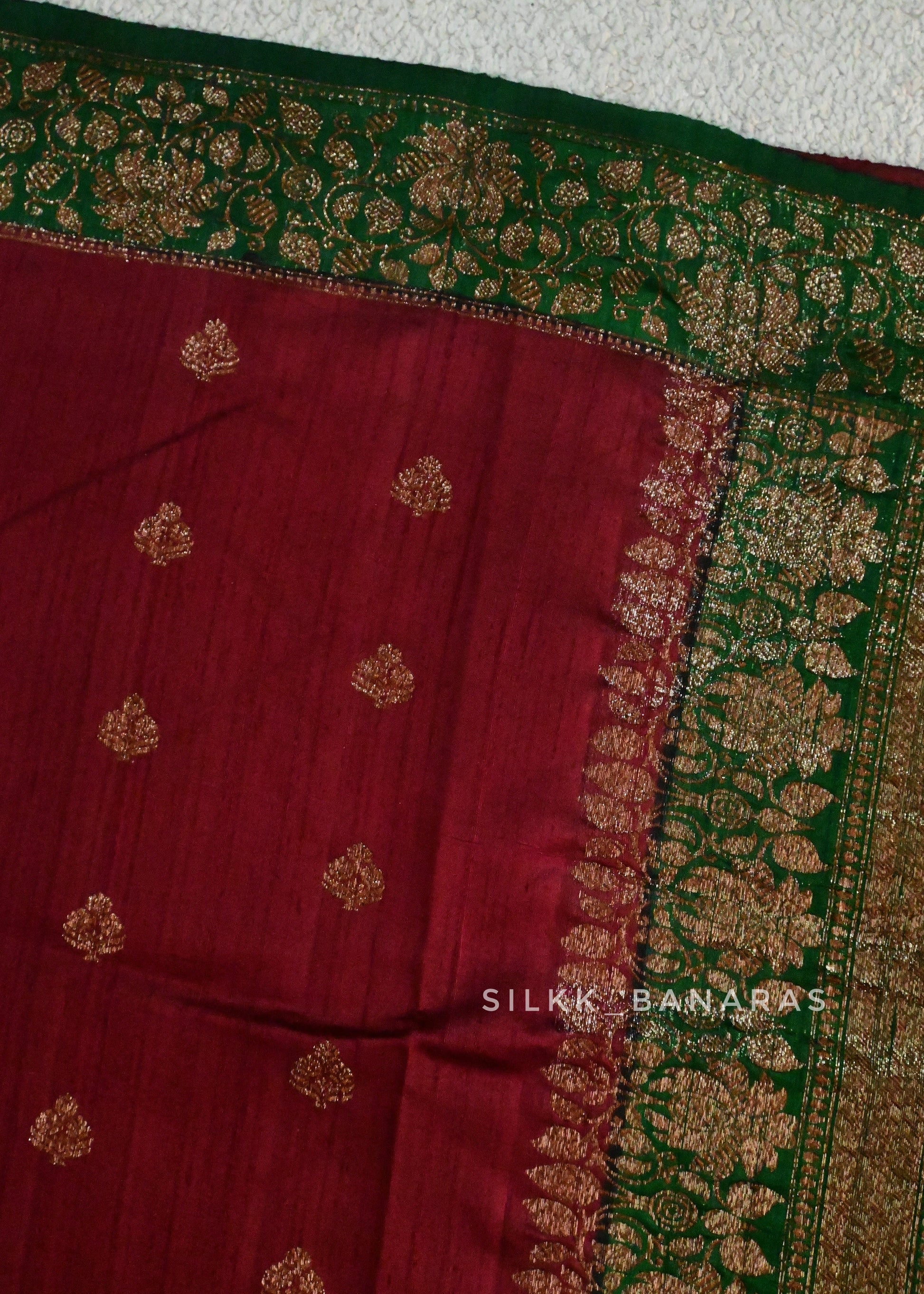 Royal sophistication defined! This deep wine maroon Banarasi features delicate gold butis sprinkled across the body, complemented by a rich emerald green border with elaborate gold zari work in traditional floral patterns.