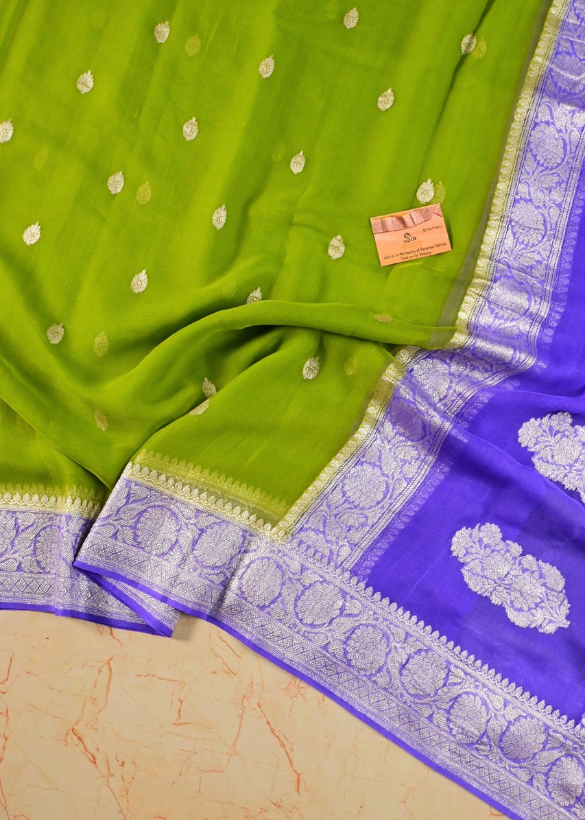 greenVibrant and vivacious! This eye-catching Banarasi combines a fresh lime green body dotted with silver butis with an electric blue pallu featuring larger silver motifs, all connected by an ornate circular patterned border.