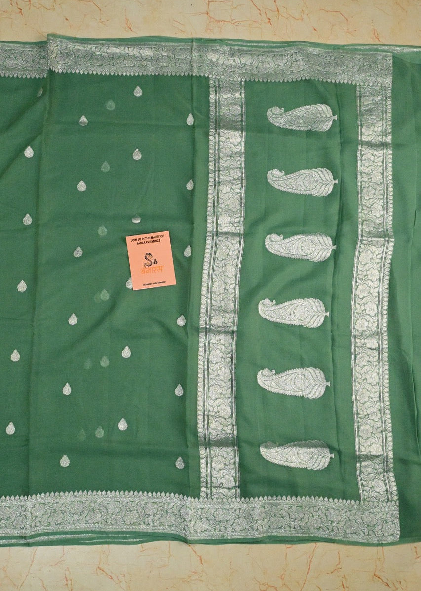 Fresh and sophisticated! This elegant emerald green Banarasi fabric features delicate silver butis throughout and stunning silver zari borders with intricate floral patterns and a charming scalloped edge detail.