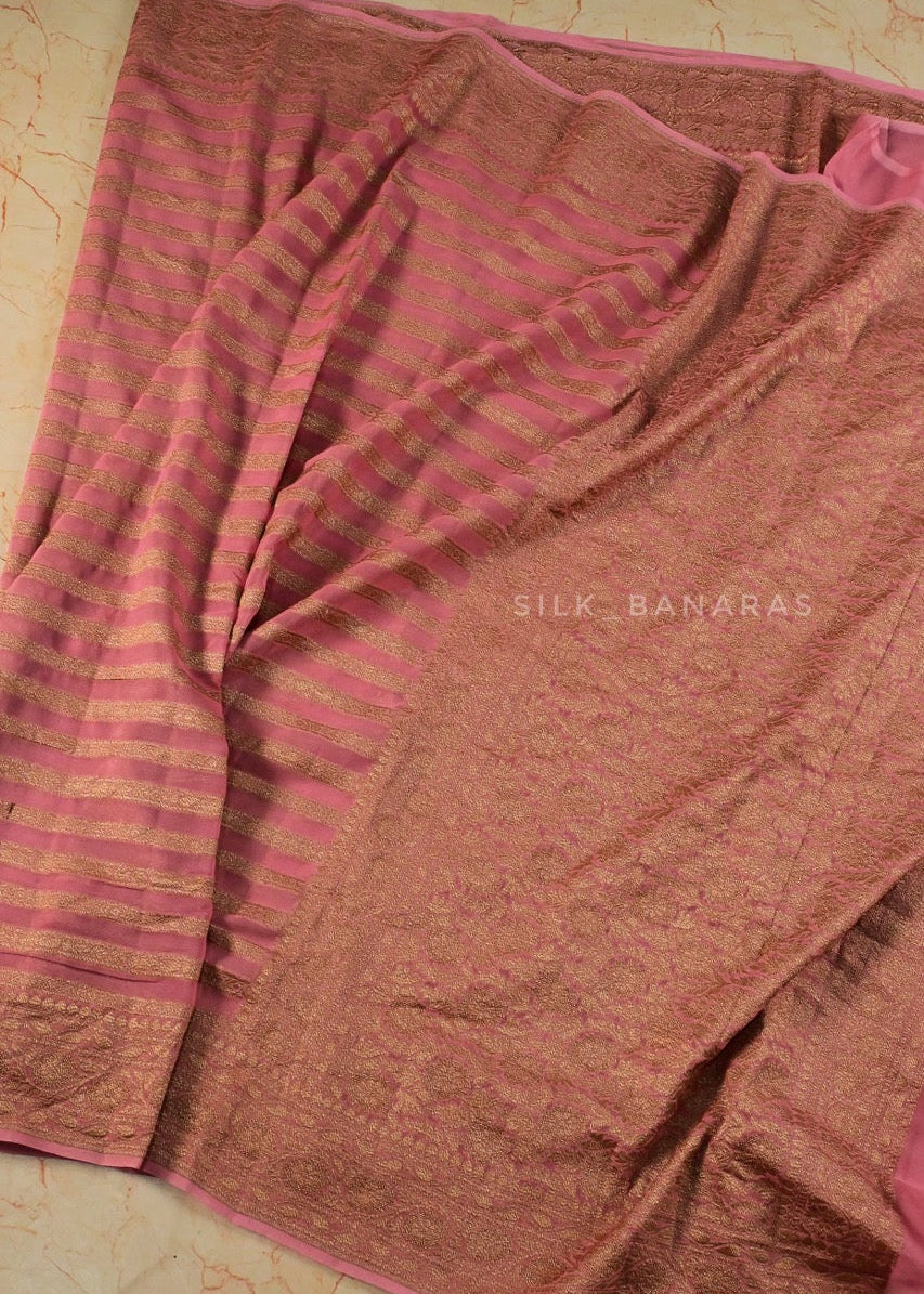 Stripes of sophistication! This gorgeous rose pink Banarasi features bold horizontal gold zari stripes across the body, creating a contemporary geometric pattern with traditional weaving techniques.