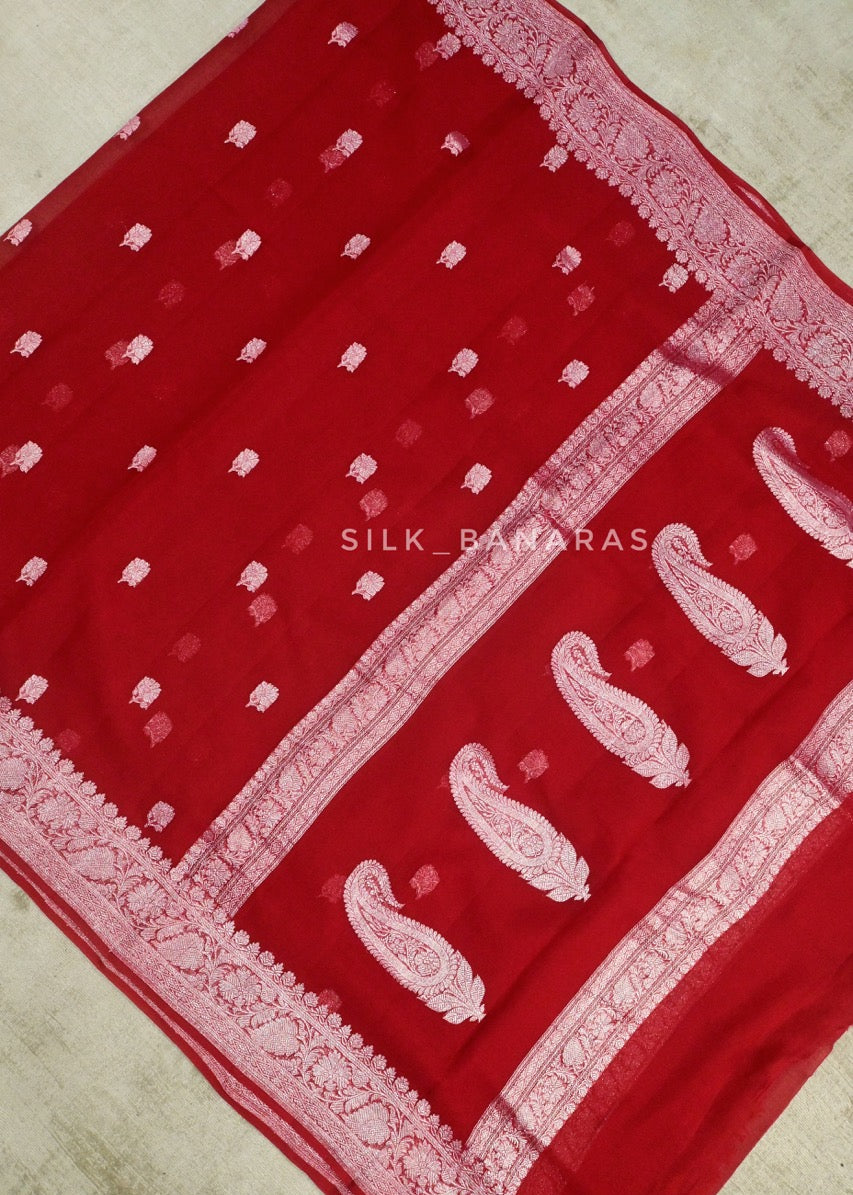 Timeless tradition in vibrant red! This stunning red Banarasi features delicate silver floral butis scattered across the body and an ornate silver zari border with intricate paisley and floral patterns.